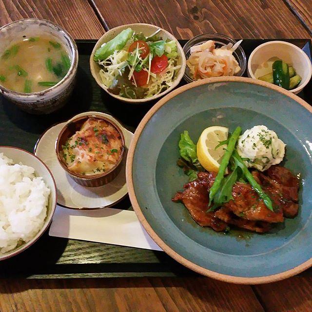 . . 日替わりランチ . . #焼き豚風ポークソテー #ホタテ入りペンネグラタン #切り干し大根と厚揚げの煮物 . .