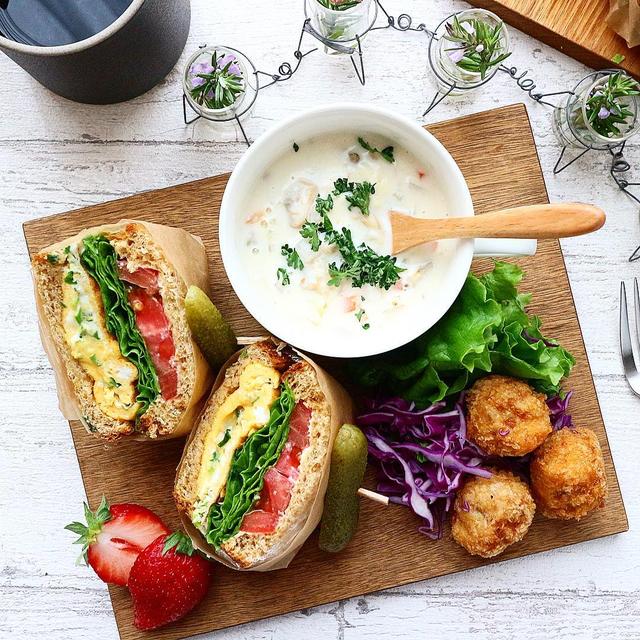 :☆本日のブランチ☆:ネギチーズオムレツサンドクラムチャウダーメンチカツいちご珈琲(Fuglen):オズマガジンを見ていたら魅惑的なオムレツサンドが載っていて真似っこバジルも挟むらしいのだけどよくレシピ見なかったからバジル用意できず...なくても美味しかった❤️:メンチカツは昨晩作ったロールキャベツのタネの残りで丸っと可愛さアピールしてみた✨:朝から胃酸が出ている感があって作りながら食べられるのだろうか...と思ったけど9割食べましたとさ1割...たかが1割されど1割...