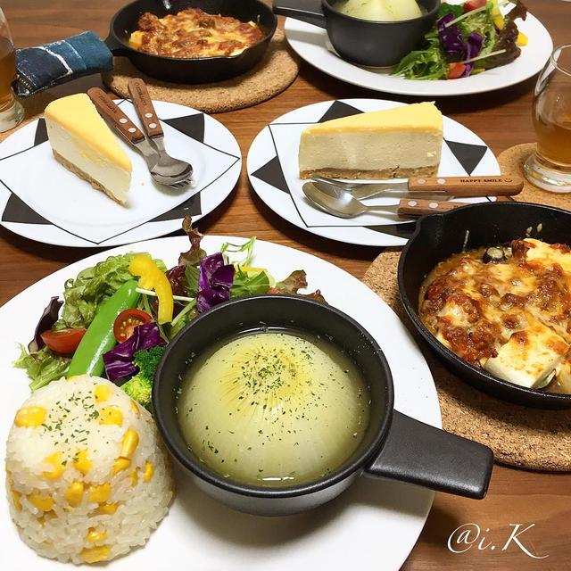 こんばんは☪⑅ ̊**前picお返事まだ途中でごめんなさい今日の#おこカフェ ☺︎...✻ コーンライス✻ 新玉丸ごとスープ✻ サラダ✻ 茄子と豆腐のミートソースグラタン✻ チーズケーキ...3日目。疲れが溜まる時ー。帰ってからはグラタン焼いてる間にサラダ作っておしまーい朝スープ作ってミートソースは解凍して❤️コーンライスは岩塩と少量のオリーブオイル、コーンを入れて固めに炊いて炊き上がったらバター入れて混ぜて完成☺️コンソメとか入れなくてもコーンの甘みと岩塩の旨味にバターのコクで十分美味しい...でかすぎな新玉さんだったから丸々1個も食べれるかなぁって心配......無用でした**#おうちごはん #こどもごはん #夕飯 #晩ごはん #料理 #カフェごはん #おうちカフェ #新玉ねぎ #グラタン #ニトスキ #野菜たっぷり #スープ#cooking #dinner #Japan #instafood #kidsfood #yummy #food #Cafe#Handmade #Kurashiru #Locari #Kaumo #onionsoup