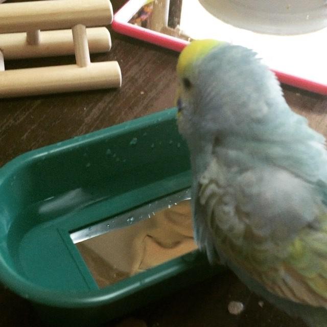 *たらいまァ。親方、電車でおでかけははじめてでした。4時間もおでかけして親方も疲れたよね〜。かあちゃんぐったり疲れたよ〜。風強いからケージが揺れて揺れて親方も激おこでした。ε( ꐦ°᷄ө°᷅ )зぷんすかピーーーーーー!親方のお友達を連れて帰ることはできなかったけれど、ミラー付きバードバスと、かじりま専科買ってきたん。*#インコ#セキセイインコ#生後6ヶ月半#ふわもこ部#おやばか部 #インコ部#おはぎやま親方#budgie#instagood#Budgerigar#parakeet#instabird#petstagram
