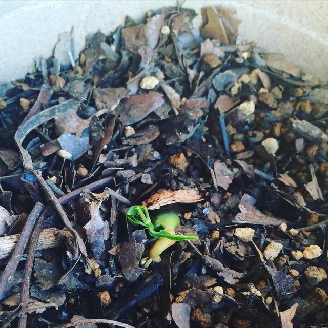 アーモンドが、ちょっと葉っぱっぽいものを伸ばし始めた。 #マーク_ワトニー日記 番外編 #アーモンドとおれ #almond