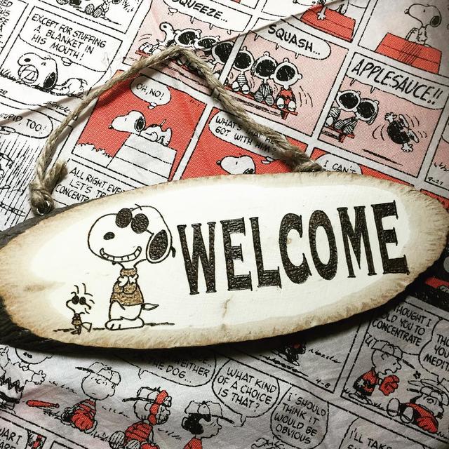 コメント閉めます☻☻☻Thank you#ウッドバーニング #焼き絵 #焦がし絵 #はんだごて #マイペン #ハンドメイド #handmade #ウェルカムボード #スヌーピー #snoopy #peanuts #Kawaii #my_favorite_peanuts #ジョークール #joecool