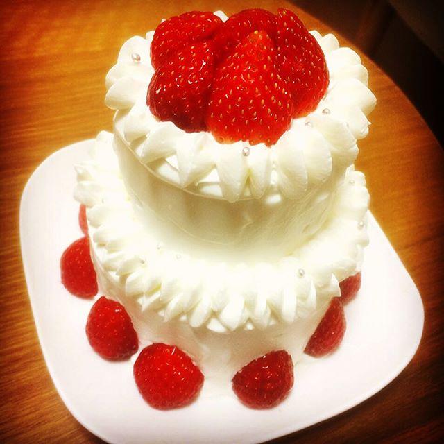 明日の為に頑張ったよ! でもキモくてやり直したい( ̇- ̇ ) #誕生日ケーキ #いちごショート #ミント買えばよかった #やり直したい #ちょっと傾いてる? #喜んでくれますように