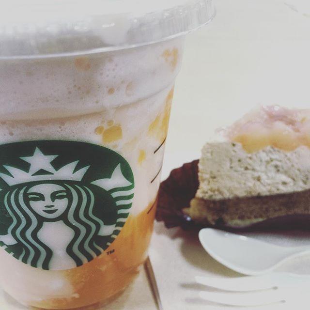 スタバ〜✨甘い&甘い幸せ #おいしい #グルメ姫 #cafe #スタバ #メロンフラペチーノ #ピーチ #タルト #おやつ #甘い #おやつタイム #相互フォロー