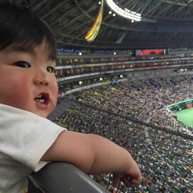 勝負の行方は!?.真剣すぎてヨダレもしたたるよね! . .スタイ5枚目 .おすずさん汗だくで観戦中⚾️✨ ..#福岡 #百道 #ヤフオクドーム #野球 #baseball #野球観戦 #ソフトバンクホークス #熱男 #1歳4ヶ月 #男の子 #福岡ママ