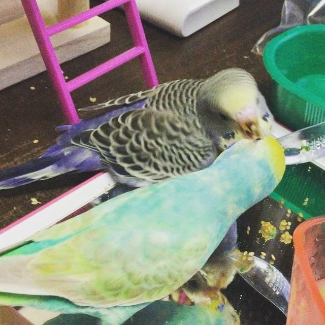 *よく食べますー!!スパングル種は元々大型セキセイ同士の交配から生まれたそうです。それを小型セキセイに受け継いでいった種ですので、スパングル種には必ず大型セキセイの血が混じっているらしく、新弟子の体重38gでしたー!親方よりも顔や頭も大きく、足も太いです。どこまで大きくなるかナ ε(。•ө•。)зのちほどコメ返しに参ります♡*#インコ#セキセイインコ#生後6ヶ月半#生後1ヶ月#ふわもこ部#おやばか部 #インコ部#おはぎやま親方#新弟子#budgie#instagood#Budgerigar#parakeet#instabird#petstagram