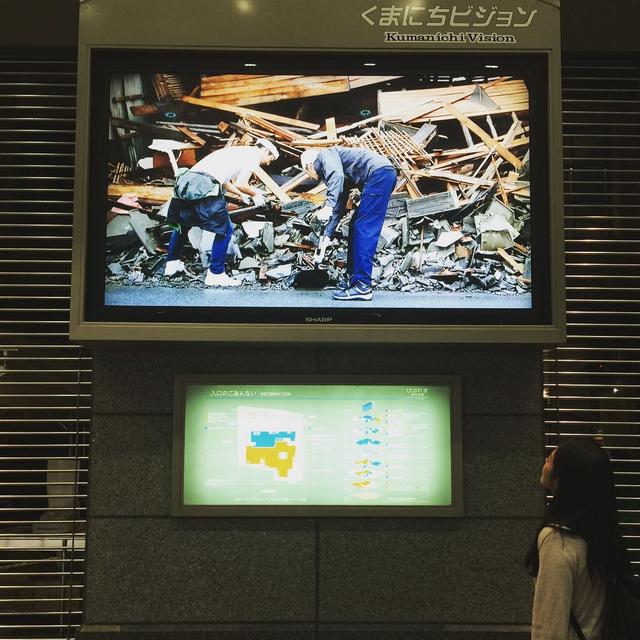 【Pray for KUMAMOTO】まだ余震が続く熊本滞在の1日目。熊本市通町、少し人通りの寂しい街角の、液晶モニターに映し出された現状がここにあります。1日も早い復興を願って、わたし達は被災に遭われたみなさまを応援します。