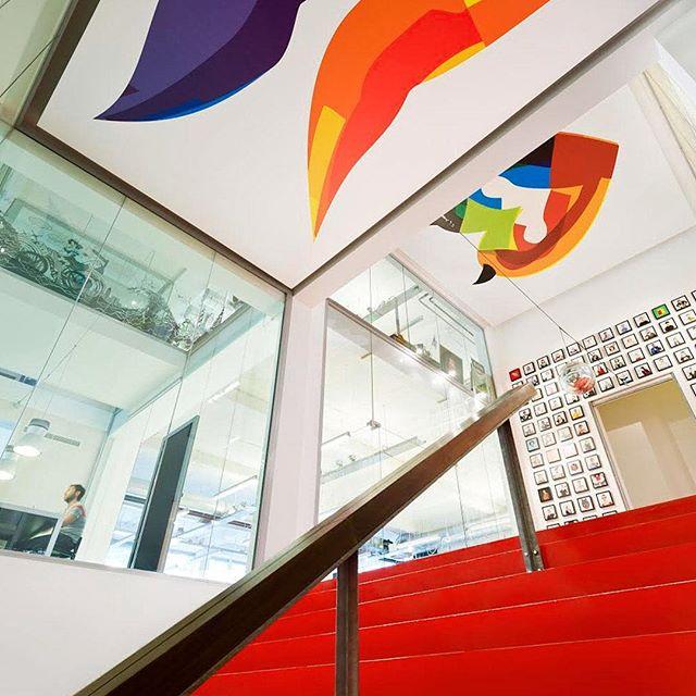 The Amsterdam office is a labyrinthine conjunction of two historical properties on the Herengracht, one of the city's main canals. Dutch illustrator Van Dijk, designed seven graphic patterns each representing a part of the human body, which are hung on huge ceiling canvases that represent the body and soul of the office itself. #creativityisaplace