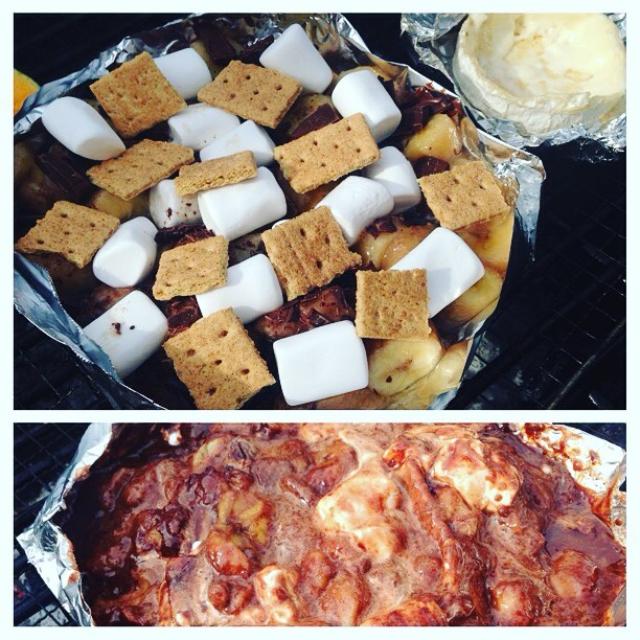 のぶオススメのバナナ&チョコ&マシュマロのホイル焼にジョイちゃんアレンジでシナモンクラッカーをプラス! ビジュアルはいまいちですが、あまあまだけど美味しい!