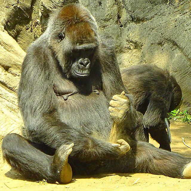 ✧トト(♀)+モモカ(♀)✧.砂遊び中のトトさん.写真のように、砂を掴んで下の手に落としていました..よく考えてみたら、トトさんはこの場所によくいるので、砂遊びがし易いスポットなのかもしれませんね..のどかで、本当に良い時間が流れていました✨✨..#上野動物園#uenozoo#動物園#zoo#動物#デジカメ#コンデジ#デジタルカメラ#ニシローランドゴリラ#ゴリラ#ゴリラ女子#トト#砂遊び