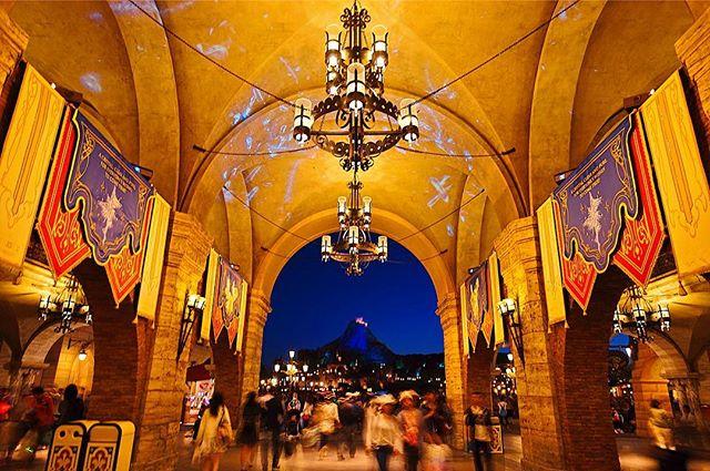 深い青の空とプロメテウス火山。ミラコスタ通りのオレンジの灯りと対照的でいよい感じ。 #東京ディズニーシー #tokyodisneysea #東京ディズニーリゾート #tokyodisneyresort