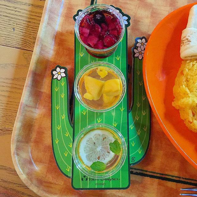 トレスフルータカクテル¥680はドリンクホルダーの可愛さにまず目を奪われ、一口飲んでパーク内のアルコールにしては強くてビックリする。これ、すごくいい!!