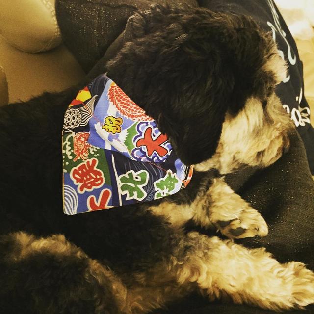 モアナさん、おニューのバンダナ。何故か大漁旗! #moana #moanamalux #モアナ #モアナマルックス #ミックス犬 #バンダナ #大漁旗 #日本海の香り