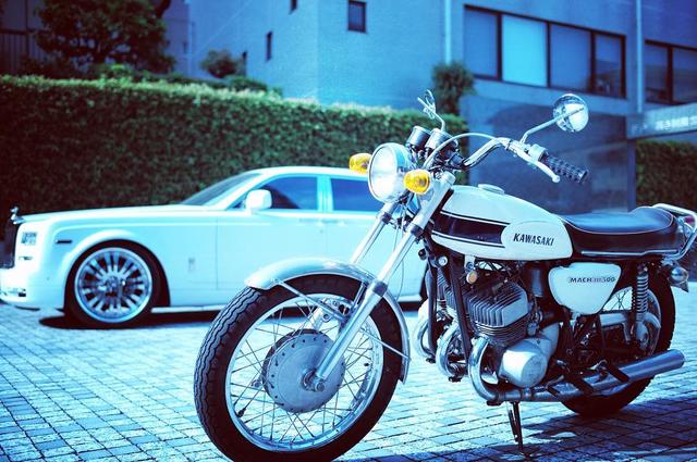 バイクびより☀️ やっぱ男は旧車のKawasakiでしょ。 車の撮影ー見に来た。 #カミナリマッパ #500ss#mach3#phantom #rollsroyce