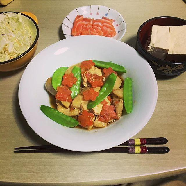 最近晩御飯載せてなかったから久々! *煮しめ *サーモン *冷奴 *サラダ #晩御飯 #自炊 #炭水化物抜きダイエット #ダイエット #和食 #料理