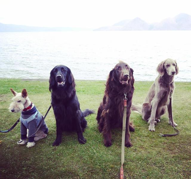 楽しかったね集合写真撮っとかなきゃね✨ #フラットコーテッドレトリバー #flatcoatedretriever #ワイヤーフォックステリア #wirefoxterrier #ロングヘアードワイマラナー #longhairedweimaraner