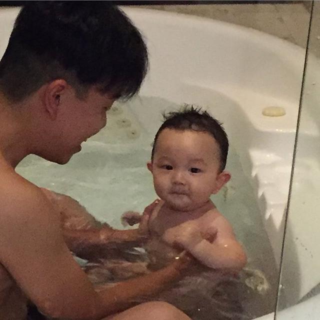 2016.5.6 とーしゃんと入浴中のこーちゃん。最近はお風呂で泳ぐ(浮かぶ?)のも大好き。とーしゃんと入る時の方がご機嫌なんよねぇ。かーしゃんジェラシーやわ。