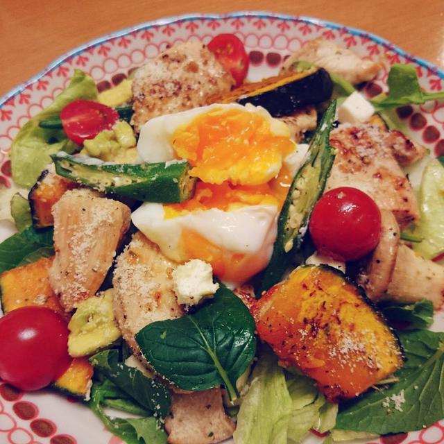 チキンといろいろ野菜のサラダ食べ過ぎ、肌荒れとか気になった時に炭水化物抜きでこれだけ食べます。これだけ。とか言いつつかなりの量だけどな!!wwチキンに、かぼちゃ、おくら、エリンギ、アボカド、クリームチーズ、トマト、レタスなどが入ってるよ!#サラダ#具だくさん#おうちごはん#食べ過ぎた日ごはん#food