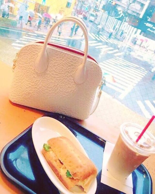 * ロンパースコーデに合わせたのは プティローズバッグのMsize Lsizeと同じく、わざとバッグを開けっ放しで使ってるよ チラっと見える裏地が可愛くて❤️ カフェしながら外眺めるの好き❤️ #バッグ #カフェ #ドトール