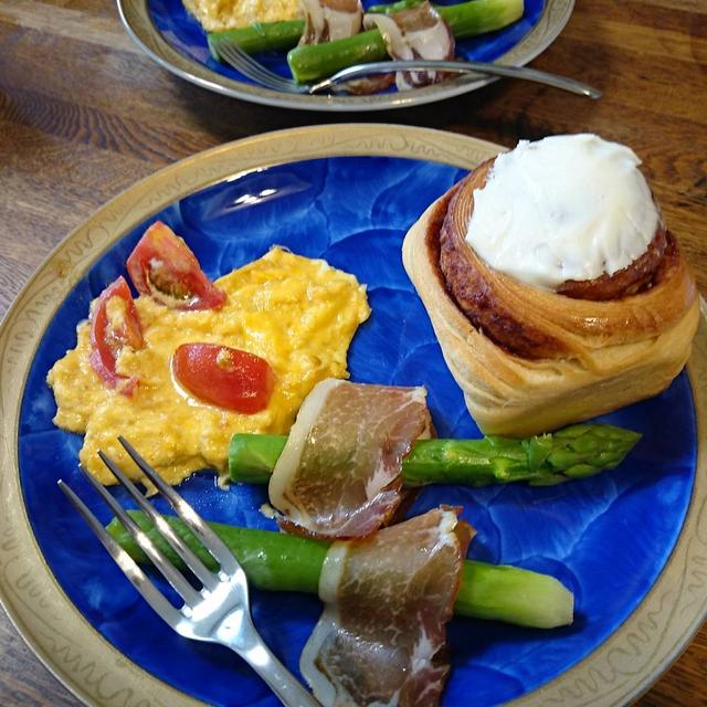 遅いお昼*シナモン✨夫も私も好きなもの *最上の土産茶屋でゲットした3Lアスパラも#ここさんのうちご飯#昼食#シナモンロール#トマトオムレツ#アスパラ生ハム#today'slunch#cinamonrolls#tomatoomlet#asparagus#hamA happy Monday