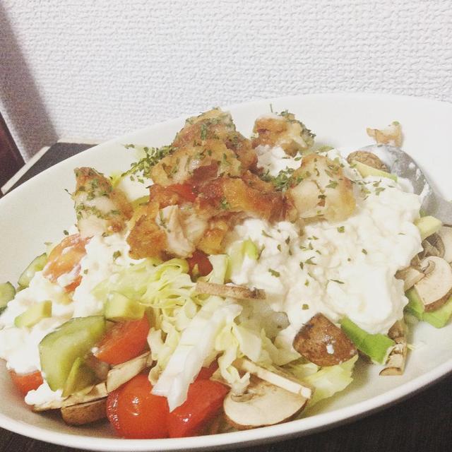 #ぼっち飯 #晩ごはん #コンビニ飯 #ダイエット飯 帰りにうっかりサークルkの唐揚げ棒を買ってしまったので、晩ごはんに。 大量野菜と豆腐ソースで多分ヘルシー(^_^;)
