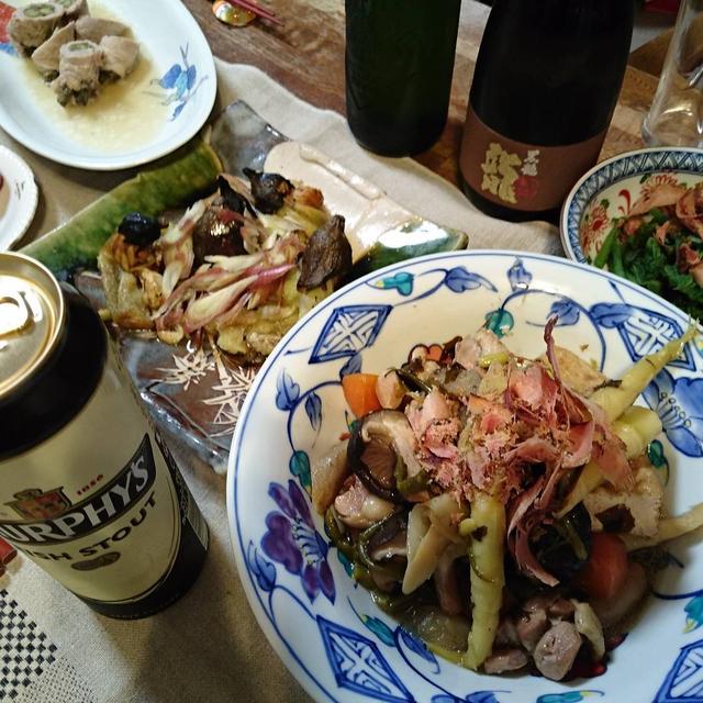 最上の土産茶屋でゲットした山菜三昧✨*筍の煮物にあいこのおひたし...うどと豚肉ロール山菜にカンハイ✨#ここさんのうちご飯#夕食#筍の煮物#あいこおひたし#焼きナス#独活の豚肉巻き#ビールやお酒#today'sdinner#wildvegetables#beerA happy Monday
