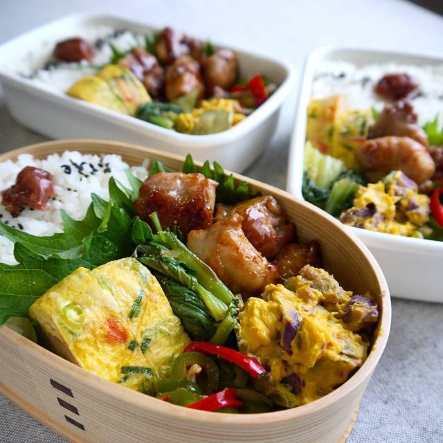 2016-05-10(火)高1・中1・夫の弁当.鶏のオイスター醤油照り焼きかにかま葱入りだし巻き卵じゃこピーマン金時芋と紫芋と南瓜のサラダチンゲン菜のごま和え.おはようございます。.お弁当の献立は夫の食事に付き合いながら考えることが多いです。今日の鶏は夫のリクエスト。小麦粉をはたいてカリッと焼いて酒、オイスターソース、醤油で味付けしてます。.「ご飯に染みないように仕切りしてな。大葉がいいかな...」と言ってからハッとして「これ以上は相談せんといて。弁当と『今週のとと姉ちゃん』は見ない主義だから」.ネタバレは楽しみ半減だそうで朝食の横で支度してても視線をこちらに向けません....