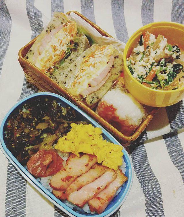 #お昼ごはん#のっけもり弁当 は姫のん#高菜#ベーコン#たまご#梅干し これだけ乗ってれば#ご飯すすむ ✨Mimoは欲張りあれこれ#黒ごまカンパーニュ #sandwich#梅干しおにぎり #白和え 母作これまた、#lunch が楽しみ✨ #サンドイッチ#bento #弁当