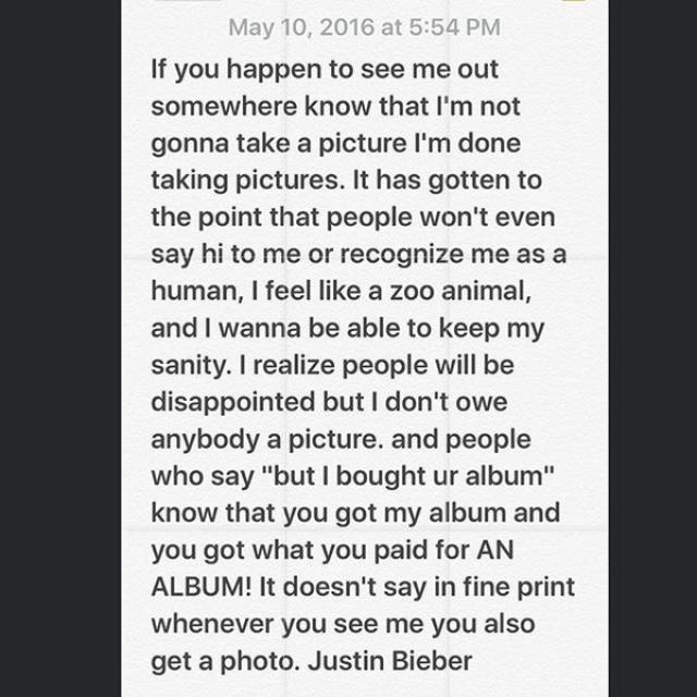 ジャスティン・ビーバーが今後ファンとは一切写真を撮らないと発表。3時間前にインスタグラムに長文の声明… https://t.co/hihr72Dfa5 #話題の画像 | https://t.co/jgJmjqBNz3 https://t.co/gh5Oyij4qt