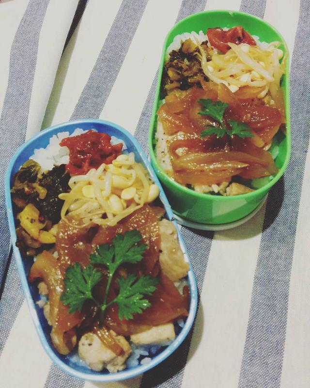 #お昼ご飯 昨日の#豚ロース #玉ねぎソース ?をのせて、#しょうが焼き風味#高菜#豆モヤシのナムル#梅干し #ベランダガーデン の#イタリアンパセリ のおかげで、彩り✨☀ #lunch#bento