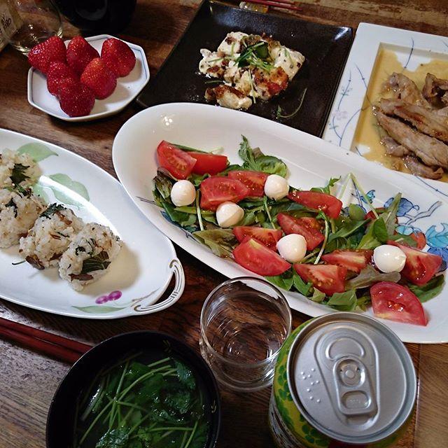 野球の試合終わって遅い夕食*再開転落まぬかれました*つかの間の...カンハイ✨#ここさんのうちご飯#夕食#カプレーゼ#豚の生姜焼き#揚げ出し豆腐#焼き鯖おにぎり#大葉#ビール#today'sdinner#caprese#porkginger#friedtofu#grilledmackerel#riceball#beerA happy day✨✨