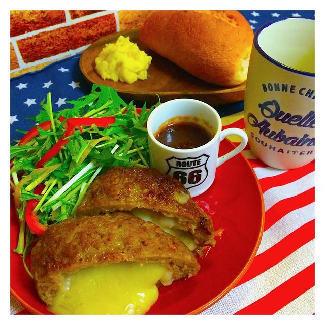 . チーズ in ハンバーグ❤️ . ブラックペッパーの効いたタネに チーズいっぱい詰め込んだー 切った時のチーズの流れと肉汁✌️ 自分で言うけどかなり美味しかった デミグラスソースも今までで一番うまくできたぜ