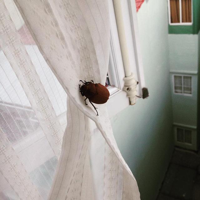 カーテンにおGちゃん!と思ったら昔ファーブル昆虫記で見たフンコロガシだった。いや、さすがに違うよな。