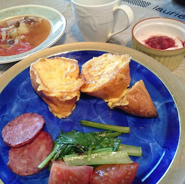 連投すみません⤵*フレンチバゲット昨夜から浸け置き*自家製のイチゴジャムヨーグルトも#ここさんのうちご飯#朝食#フレンチバゲット#トマトスープ#ヨーグルト#イチゴジャム#today'sbreakfast#frenchbaguette#tomatosoup#yogurt#strawberryjam#homemadeA happy day✨✨