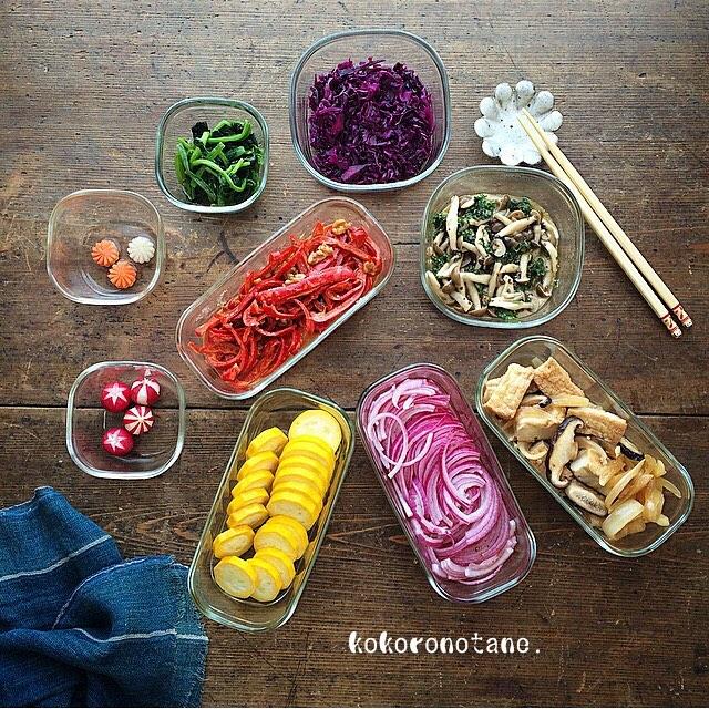 ❁.*⋆✧°.*⋆✧❁作り置きおかず。・今週は、まとめて作らなかったので日々ちょい足しで。#・❁厚揚げ&玉ねぎ&椎茸の麺つゆソテー❁赤ピーマン&胡桃のピーナッツクリーム和え❁しめじ&パセリのマスタードソース和え❁ほうれん草のお浸し❁紫キャベツのナムル❁ズッキーニのマリネ❁赤玉ねぎのマリネ❁人参と大根の甘酢漬け❁飾りラディッシュ・・#こころのたね常備菜 ・❁.*⋆✧°.*⋆✧°.*⋆✧°❁