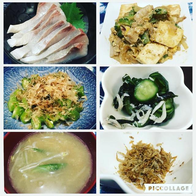 #ゆうごはん #かんぱち刺身 #ゴーヤチャンプル #キュウリの酢の物 #オクラおかか和え #じゃこふりかけ #いんげんともやしの味噌汁 #helthyfood #japanesefood #yummyinmytummy