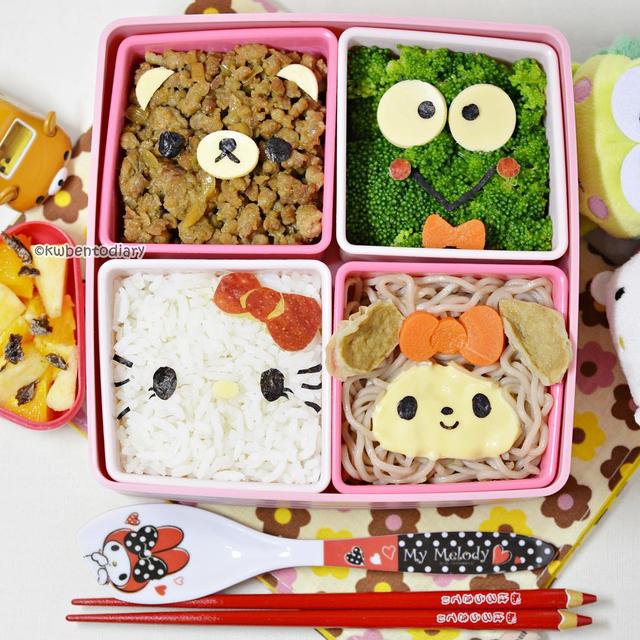 19 May 2016▶️Rilakkuma: Minced meat on top of the rice▶️Keroppi: Broccoli/cheese/carrot/nori/apple ▶️MyMelody: Noodles/carrot/cheese/tofu skin▶️HelloKitty: Nori/apple/rice..#sanrio #sanx #hellokitty #kerropi #mymelody #foodart #instafood #kwbentodiary #kidsbento #kidslunch #kidsfood #lunch #lunchbox #kawaii #characters #bento #obento #创意 #食物 #便当 #啦啦熊 #吉蒂猫 #凯蒂猫 #美乐蒂 #弁当 #お弁当 #大眼蛙 #三丽鸥