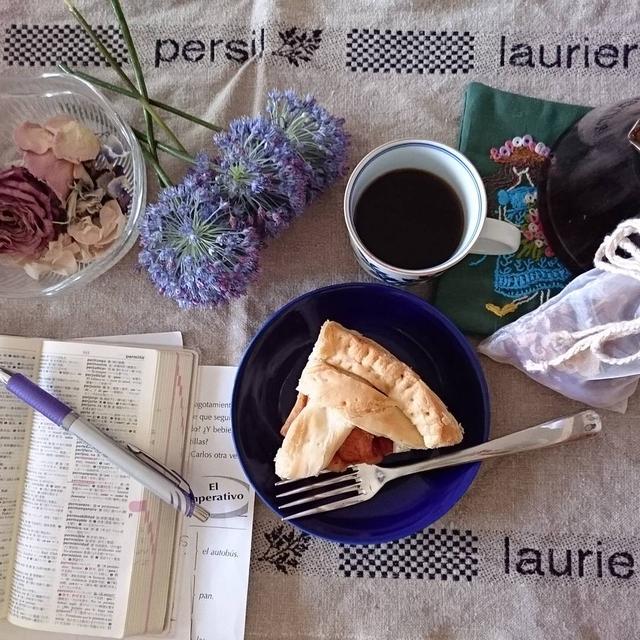 今日の庭仕事終了*好きなもの達を眺めてアップルパイでお茶します☕#ここさんのうちご飯#お茶の時間#アップルパイ#自家製#ポットマット#刺繍#サシェ#手仕事#スペイン語予習#coffeebreak#spanish#practicing#applepie#homemade#potmat#embroidery#sachet#handworkA happy Thursday