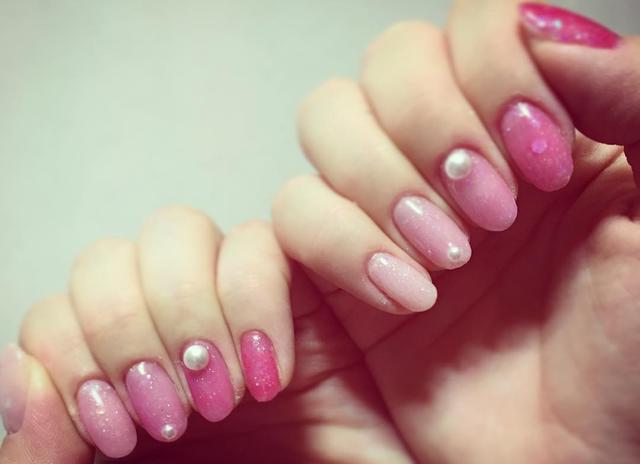 #nail_sayumynail!明日も頑張ろうっ。BGMをiPhoneからnewアルバム流しながら( •̀ .̫ •́ )✧ネイルを夜なべして帰りました( ́-`).。oOあすかの結婚式出席用今日はあすかがブライダルネイルでご来店♡ネイルupは後日*\(^o^)/* そして1週間で、外すのでシンプルめ。ラメの上に乳白がお気に入り〜♡#nail #ネイル #グラデーション #パール #ピンク #pink #pinknails #ピンクネイル