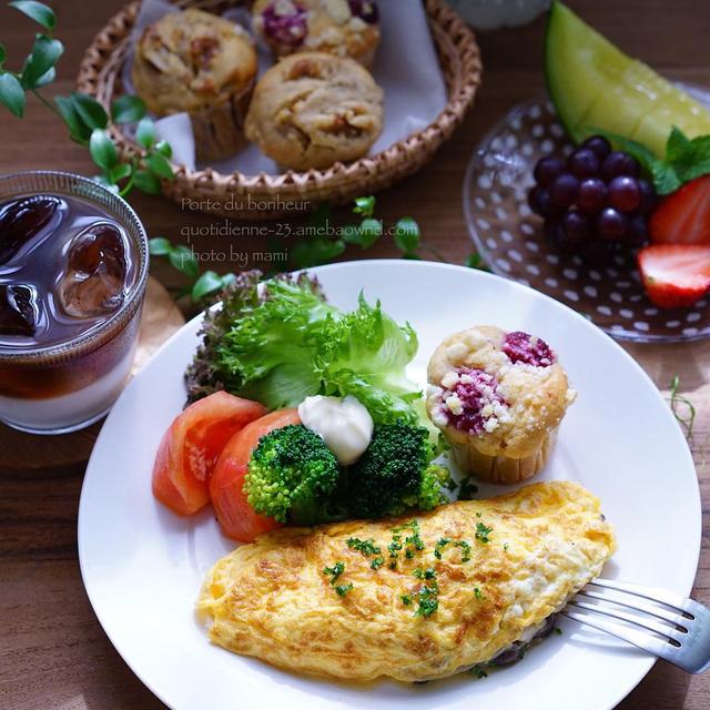 Banana muffins and cherry muffin .『 マフィンで朝ごはん 』。..おはようございます♬ .今朝は昨日焼いたバナナと胡桃のマフィンとアメリカンチェリーのマフィンで朝ごはんです ...アメリカンチェリーはコンポートにしてから生地に入れてやきました ...オムレツの中には 玉ねぎとしめじのソテーした物が入ってます ....※ ブログ更新しました☺️ ....
