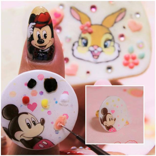今更ですが、リングパレット?パレットリング?指輪パレット?作ってみましたー本物買いたかったけど、きっとサイズ合わなくてクルクルまわっちゃうよなーと思って、とりあえず自分で作ってみたけど、サイズ小さくしてもやっぱりクルクル回っちゃうでもミッキー描いたからいっぱい使お❤#handmade #handpainted #ハンドメイド#指輪パレット #リングパレット #パレットリング