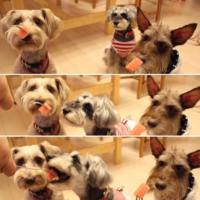 今日は、あんたんと我が家で晩御飯❤️.あんたんママから今年初のスイカのお土産❤️.3ワンで仲良く!?️.ファビ、後ろで狙いを定めて.あんたろ〜脇から奪ってごめんね〜.この後は、仲良くみんなで美味しいをいただきました〜❤️✨