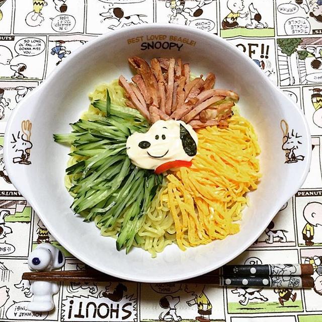 #冷やし中華はじめました冷やし中華にはマヨネーズ海苔貼ってスヌーピーに。首輪はプチトマトですかわゆい #ランチクロス は@inumaiko まいこちゃんからのプレゼントお裁縫できない私、手作りクロスすーっごくうれしい❤️ありがとう!#素敵便 #冷やし中華 #マヨネーズアート #スヌーピー #snoopy #peanuts #snoopyfood #cutefood #decofood #kawaiifood #foodart #クッキングラム