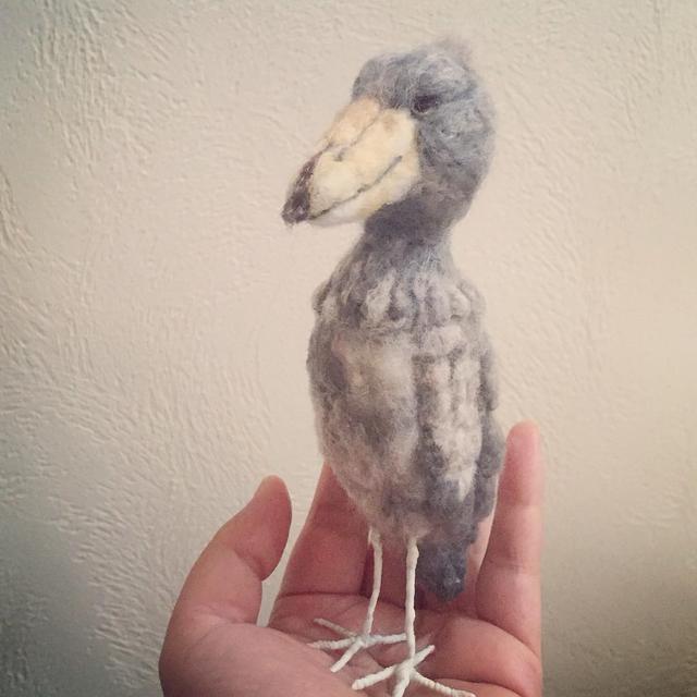 手乗りハシビロコウ。 人見知りです。 #羊毛フェルト #needlefelting #ハシビロコウ