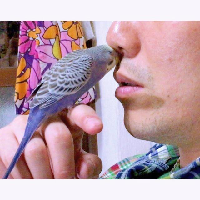 *とうちゃん子な琴紫。とうちゃんにおでこくっつけてよくハナシを聞いています。※かあちゃんジェラシー*#インコ#セキセイインコ#生後7ヶ月#生後1ヶ月半#ふわもこ部#おやばか部#インコ部#おはぎやま部屋#おはぎやま親方#親方#新弟子#琴紫#琴ちゃん#budgie#instagood#Budgerigar#parakeet#instabird#petstagram