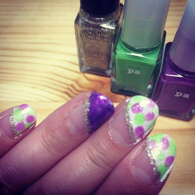 new nail♡斜めフレンチに初挑戦したけど、めちゃくちゃ難しいー!!本当はもうちょっと色を淡くして、紫陽花みたいにしたかったんだけどなー。次頑張る!#nails #nailart #selfnail #purple #green #manicure #紫陽花 #nailholic