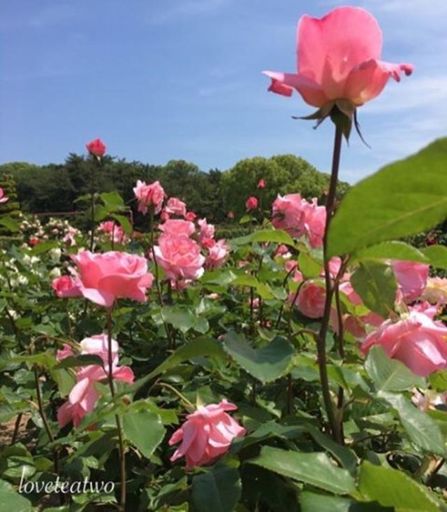 #roses #rosegarden #pink #green #sky #blue #queenelizabeth #はなまっぷ #クィーンエリザベス #instagramjapan
