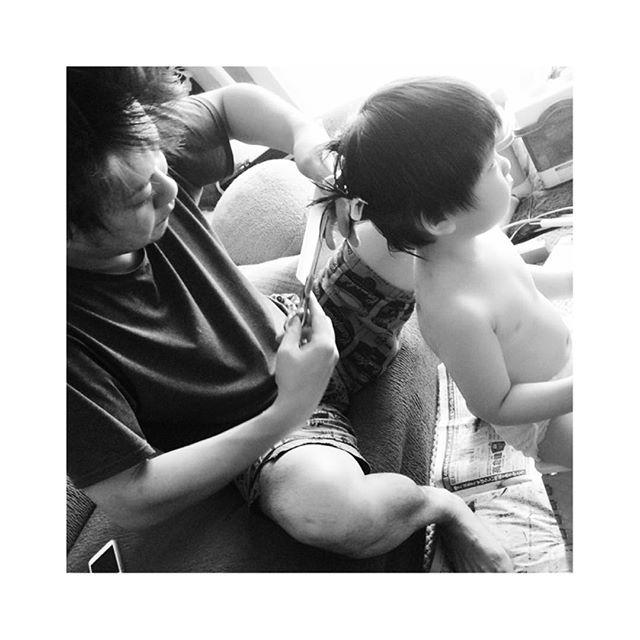 海斗の髪がモサ男になっていたのでパパにカットしてもらってまーす✂︎なう #3歳半#男の子#セルフカット#髪の毛#モサ #出来上がりは後ほど#楽しみ#パパ#お任せ #カット#元美容師#手に職#うらやましいぜ #ig_kids#ig_kidsphoto