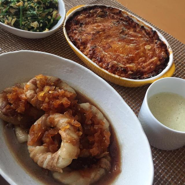 おうちごはん〜 ★新玉ねぎ豚肉ロール★豆腐ラザニア★ほうれん草の卵とじ★じゃがいもスープ#おうちごはん#あやのごはん#手料理#豆腐ラザニア#餃子の皮#チーズたっぷり#焦げちゃった#新玉ねぎ豚肉ロール#美味しい#オススメ#ほうれん草卵とじ#安定#じゃがいもスープ#上出来#らぶ#ありがとう#cooking#yummy#love#happy#thankyou#smile