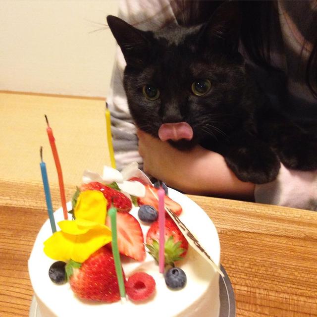 クロチ、荒技家猫修行の後は、狙ってる!?️ #猫 #ねこ #ネコ #cat #黒ちゃん #黒ネコ #黒ねこ #黒猫 #誕生日 #ケーキ #オフク